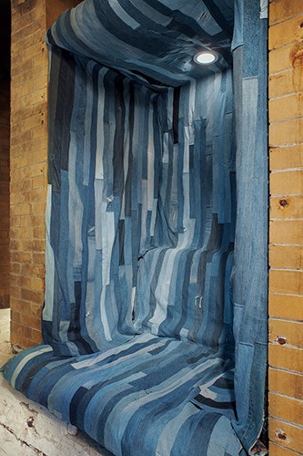 Three videos on iPads, denim, plywood, foam, lights, speakers